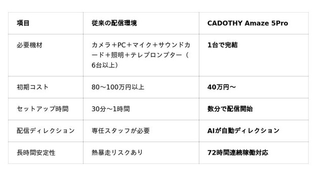 本提携の第一弾として、CREOKはCadothyのフラッグシップモデル「CADOTHY Amaze 5Pro」の日本国内における独占販売および導入支援を開始いたします。日本最大級のライブコマース専用拠点「CREOK LAB」への全面導入も同時に実施し、国内ブランド、クリエイター、EC事業者に向けた"プロ品質のライブコマース配信環境"の提供を本格化いたします。