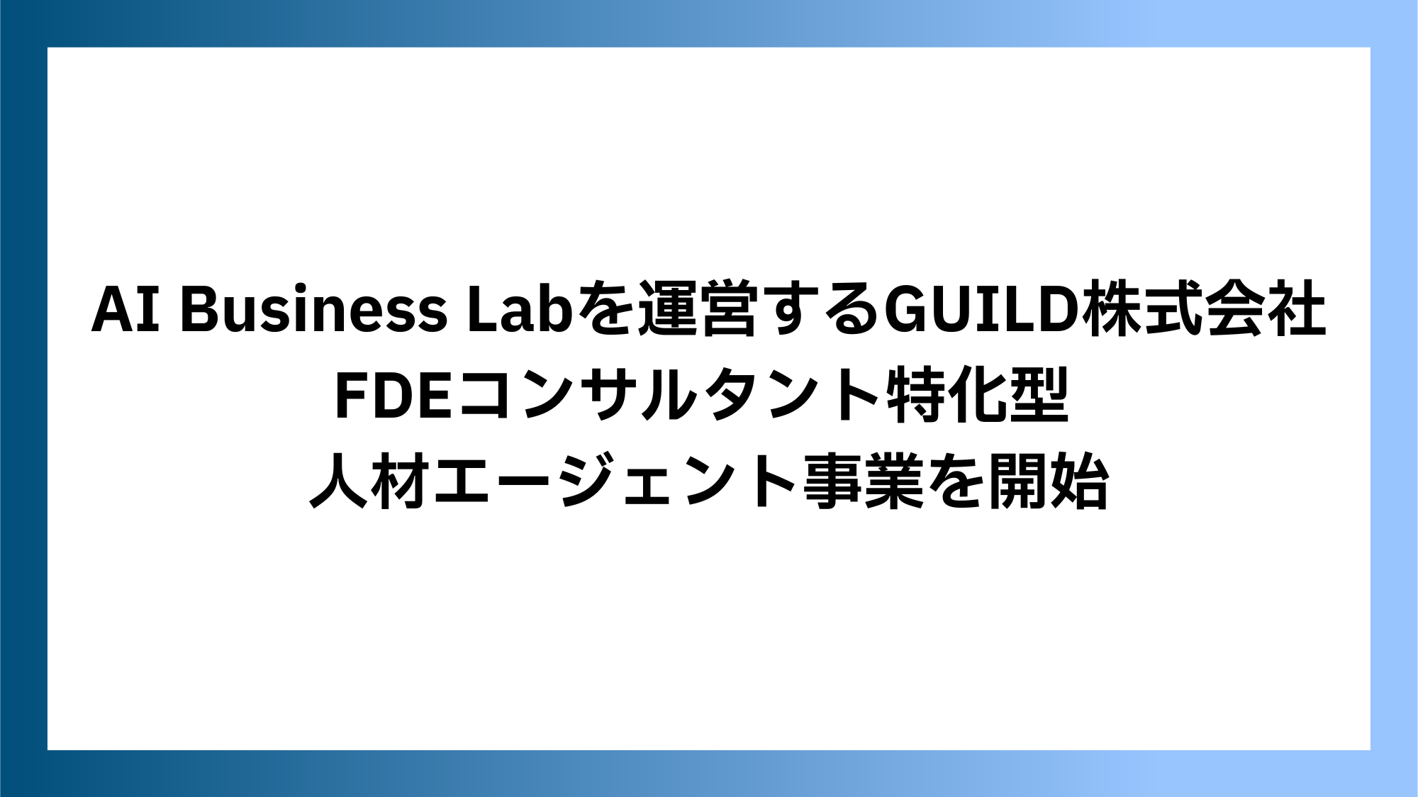 AI Business Labを運営するGUILD株式会社(所在地:東京都渋谷区神宮前、代表:小宮 滉)は、本日、FDE(Forward Deployed Engineer=フォワードデプロイドエンジニア)コンサルタントに特化した人材エージェント事業を開始することをお知らせいたします。