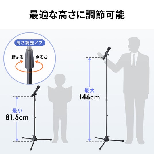 スタンドの高さの上下可動はもちろん、クリップ式のマイクホルダーは様々なサイズに対応します。