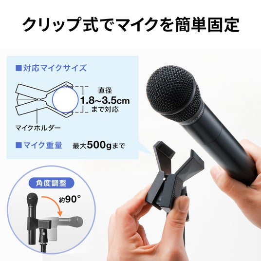 ワンタッチで取り付けできるクリップ式のマイクホルダーが付属しています。最大直径3.5cmまでの様々なマイクに対応しており、角度も調整できます。