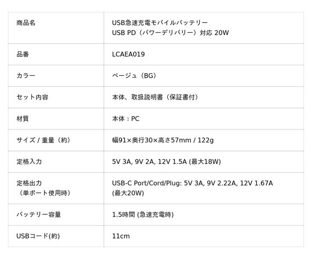 「USB急速充電モバイルバッテリー USB PD(パワーデリバリー)対応 20W」LCAEA019