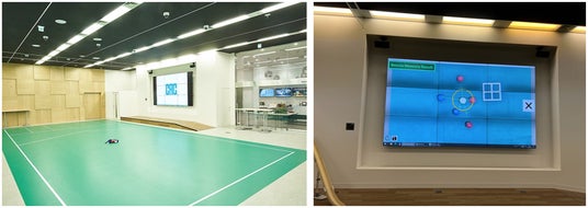 【画像】株式会社CAC Holdingsの本社1階にある、CACボッチャコート。壁面には天井カメラと連携し、 ゲームの盤面を映し出す大型モニターも備える