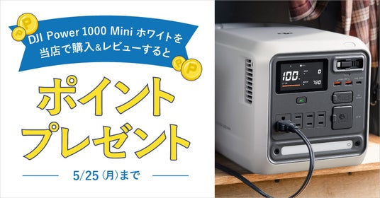 対象期間中にシステムファイブでDJI Power 1000 Mini ホワイトを購入し、商品を実際にお使いいただいた感想を条件に沿ってレビューを投稿していただくと、採用時に次回のお買い物でご利用可能なポイントを最大5,000円分(5,000ポイント)プレゼントいたします。